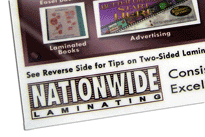 At Nationwide Laminating, we have five high-speed manufacturing lines ready to produce two-sided jobs in runs large or small. In addition to one- and two-sided laminating, we provide mounting, plastic coil binding, shrink wrapping and fulfillment-meaning you can drop it off, and we'll take it from there. And with 24-hour turnaround on most jobs, you can rely on Nationwide Laminating as your finishing solutions partner.